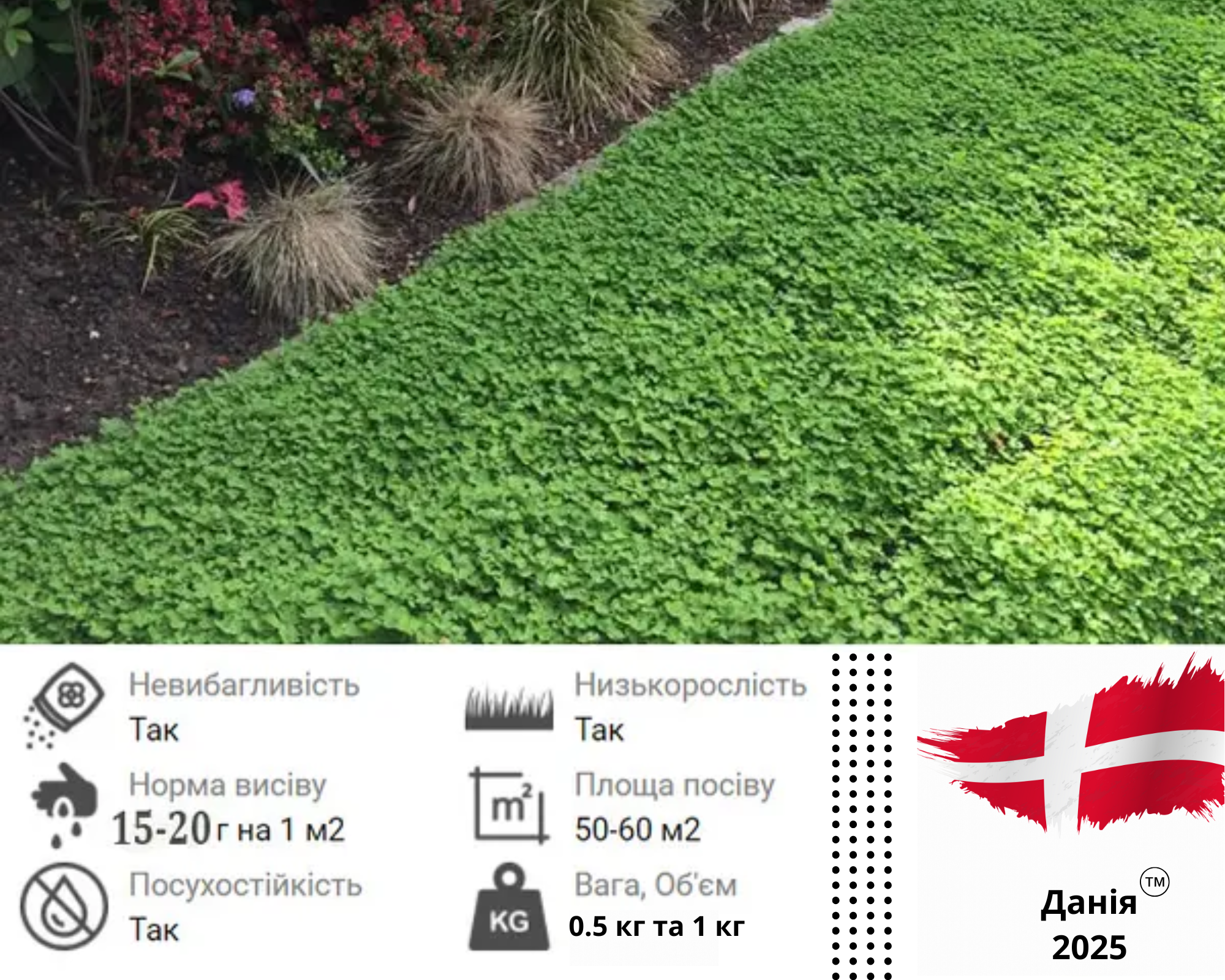 Мікро конюшина - ідеальний зелений килим для вашої ділянки! Мікро конюшина - це низькоросла різновид конюшини, що відрізняється мініатюрним листям і щільним покривом. Він росте повільно, практично не вимагає стрижки, стійкий до витоптування, посухи та морозів. Завдяки здатності збагачувати ґрунт азотом, мікро конюшина знижує потребу у добривах та покращує стан газону без зайвої хімії.